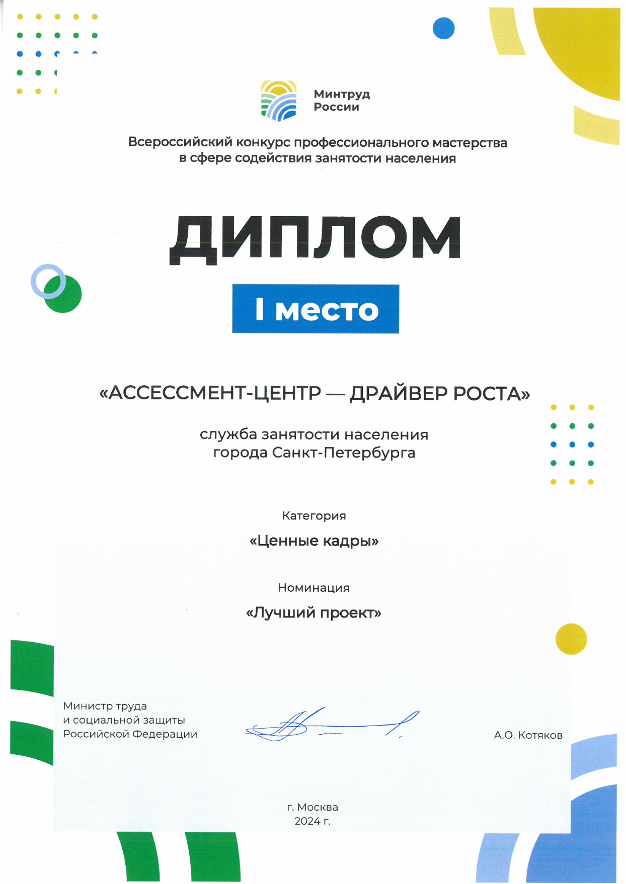 В середине декабря 2024 года Министерство труда и социальной защиты РФ подвело итоги III Всероссийского конкурса профессионального мастерства в сфере содействия занятости населения. В этом году петербургский Центр занятости завоевал два первых места, одно из них — вновь за лучший проект. Напомним, что в прошлом году наш Учебный центр уже одержал победу в этом конкурсе в той же номинации.